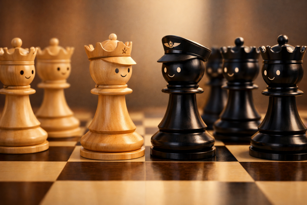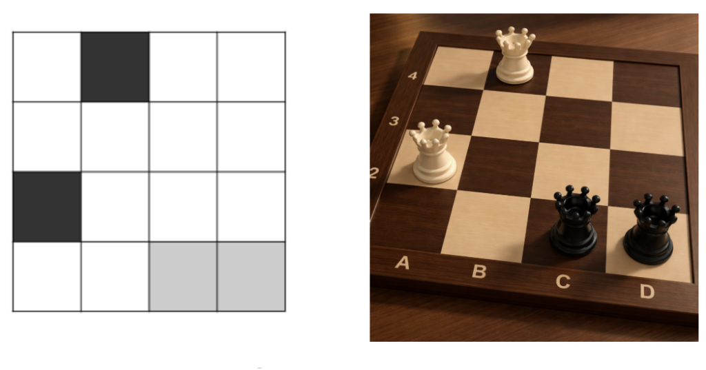 Figure 1: Example for D=4 and AI-generated image (AI mixed up the queen colors). Result is N=2, two black and two white peaceable queens.