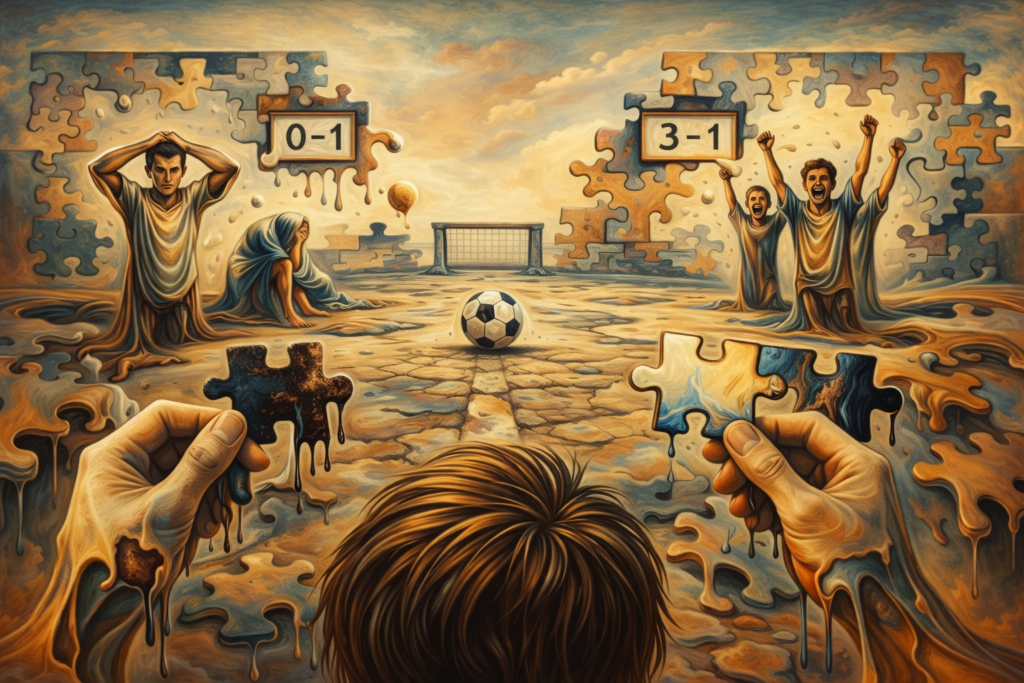 Im Endeffekt lag hier eine Art des “Confirmation Bias” bzw. “Motivated Reasoning” vor. Hier findet man sich selbst in einer Situation wieder von der man überzeugt ist, bzw. ist einer Meinung oder man hat eine Entscheidung getroffen, für deren Richtigkeit man retrospektiv Gründe (er)findet. In diesem Fall haben wir uns für unsere Wahrnehmung entschieden und solange Argumente für das Wetter, die kurze Halbzeitpause, den falschen Liveticker, das ähnliche Tor etc. erfunden, bis die Hinweise doch so deutlich waren, dass das Kartenhaus zusammenfallen musste. Und es hatte erstaunlich lange gedauert.